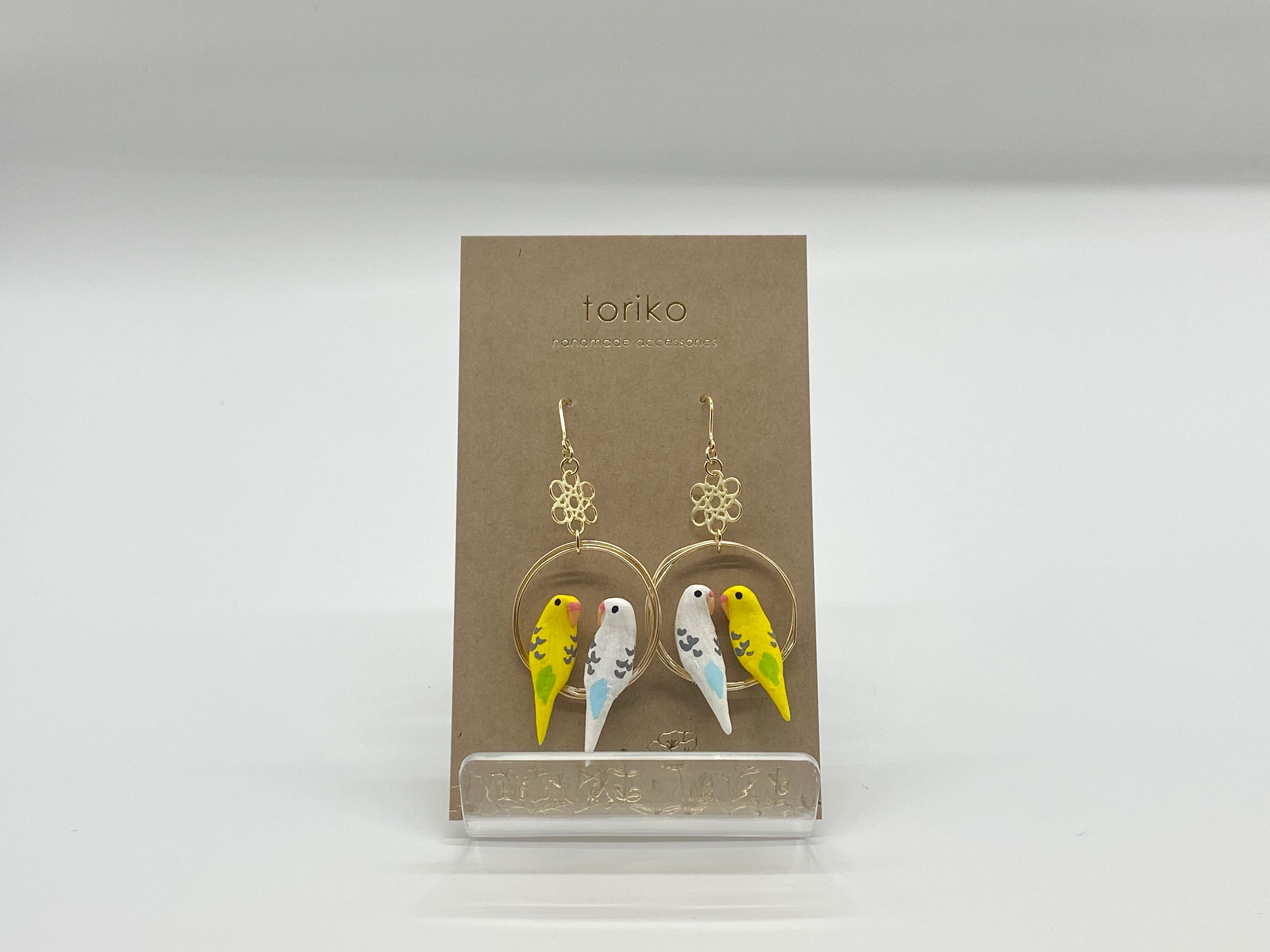 2羽乗りセキセイインコ(白×黄)花パーツ付ピアス・イヤリング