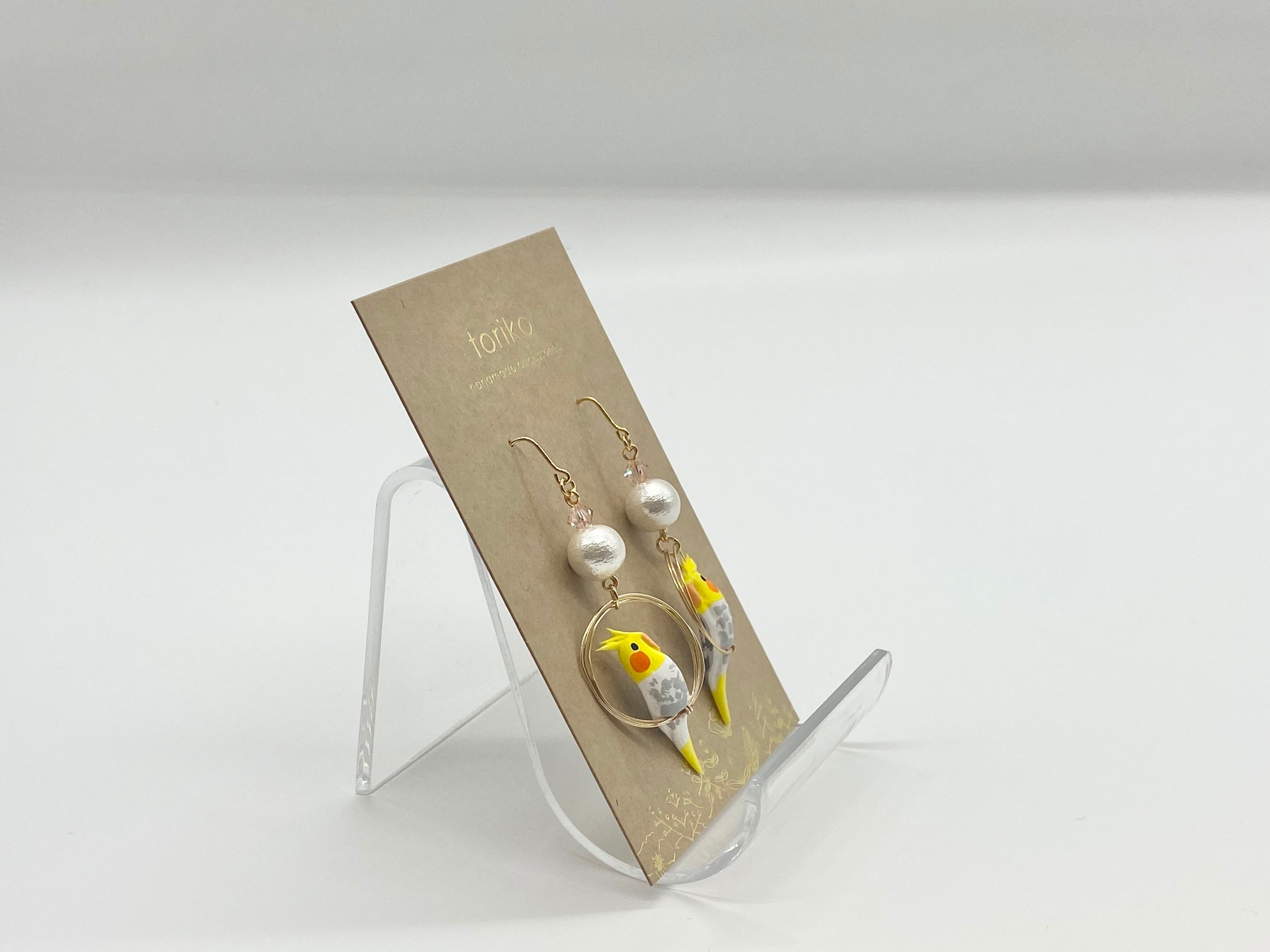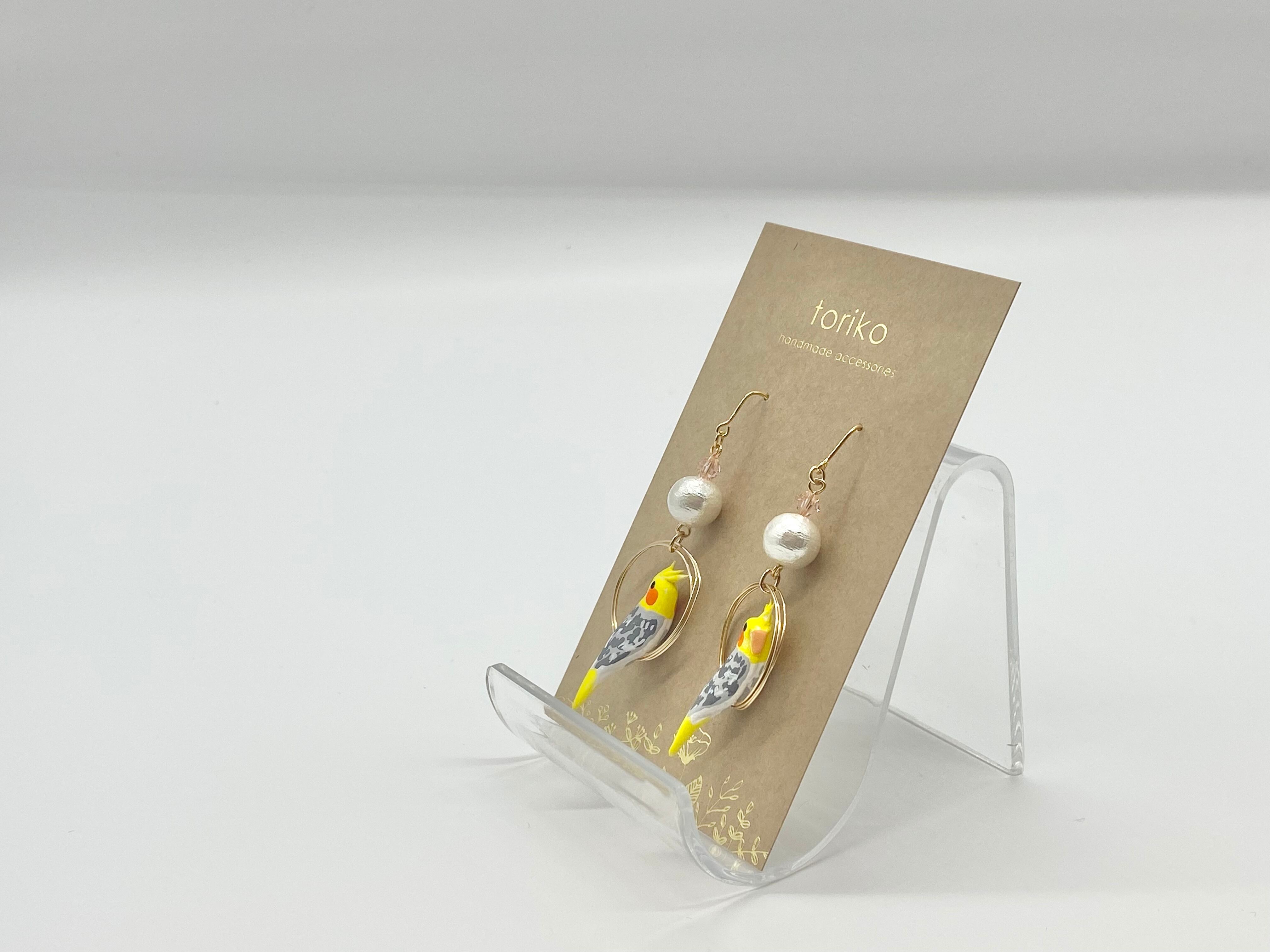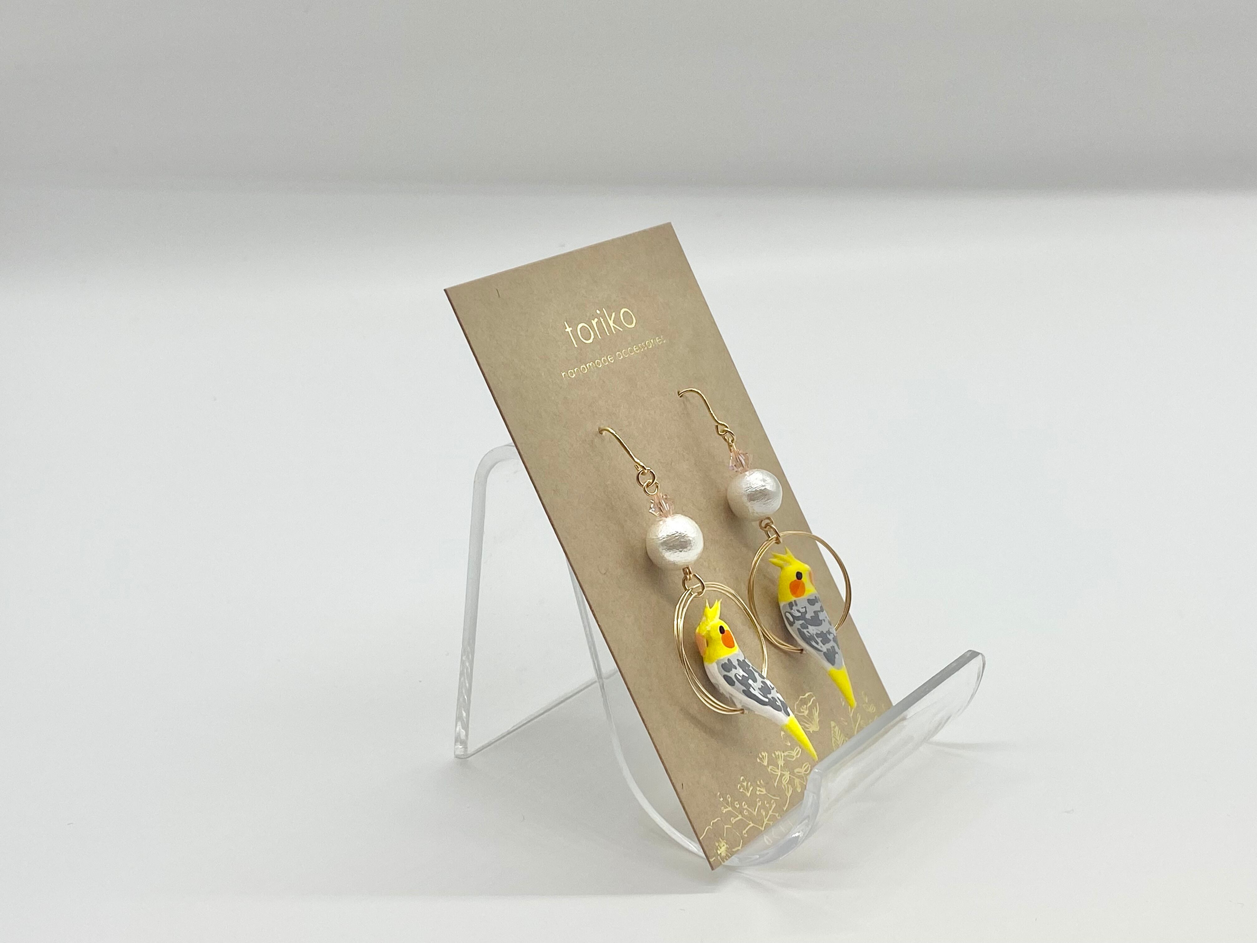 オカメインコ(パイド)をリングに乗せて、コットンパールを飾った爽やかなピアス・イヤリングです。