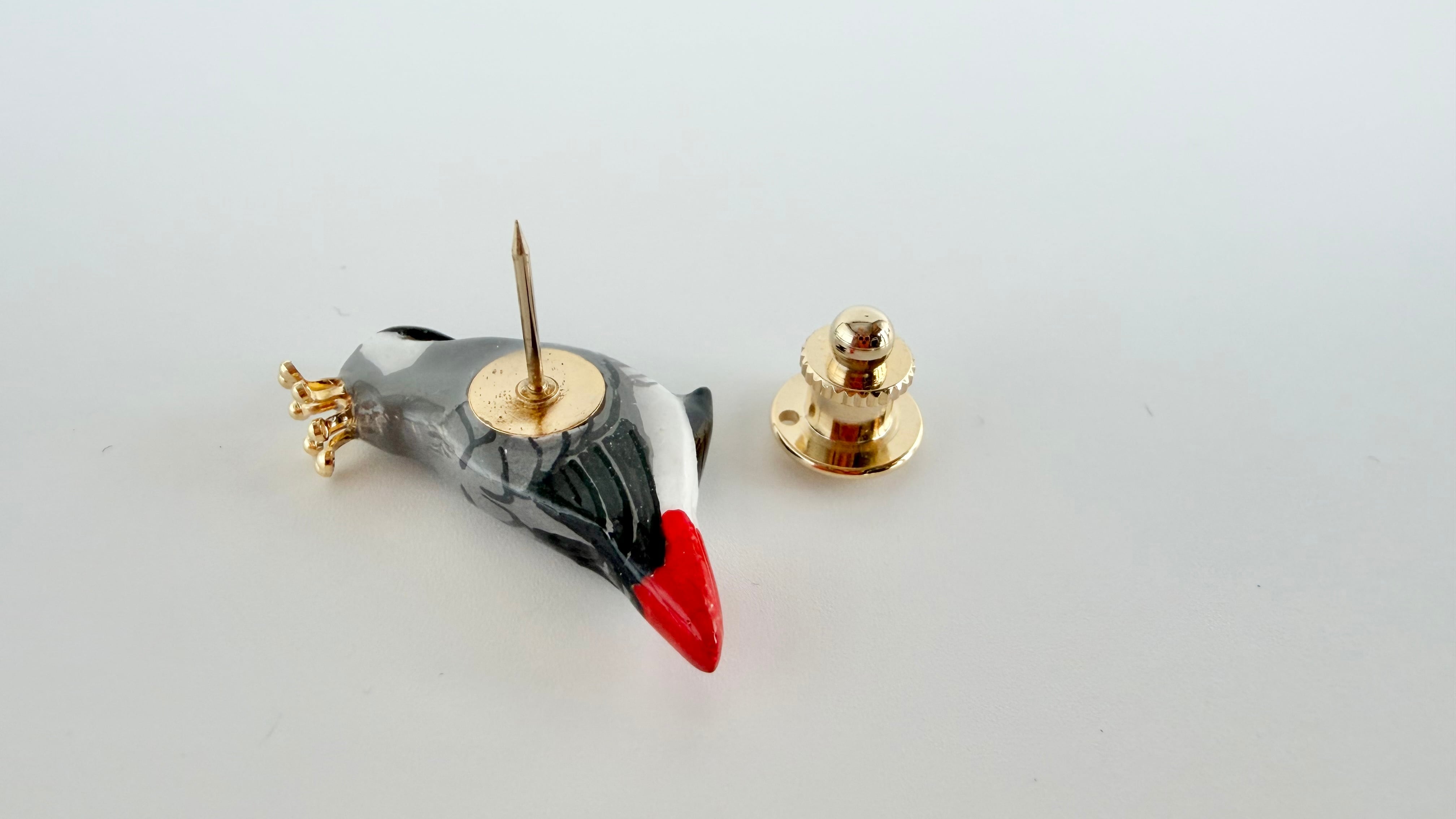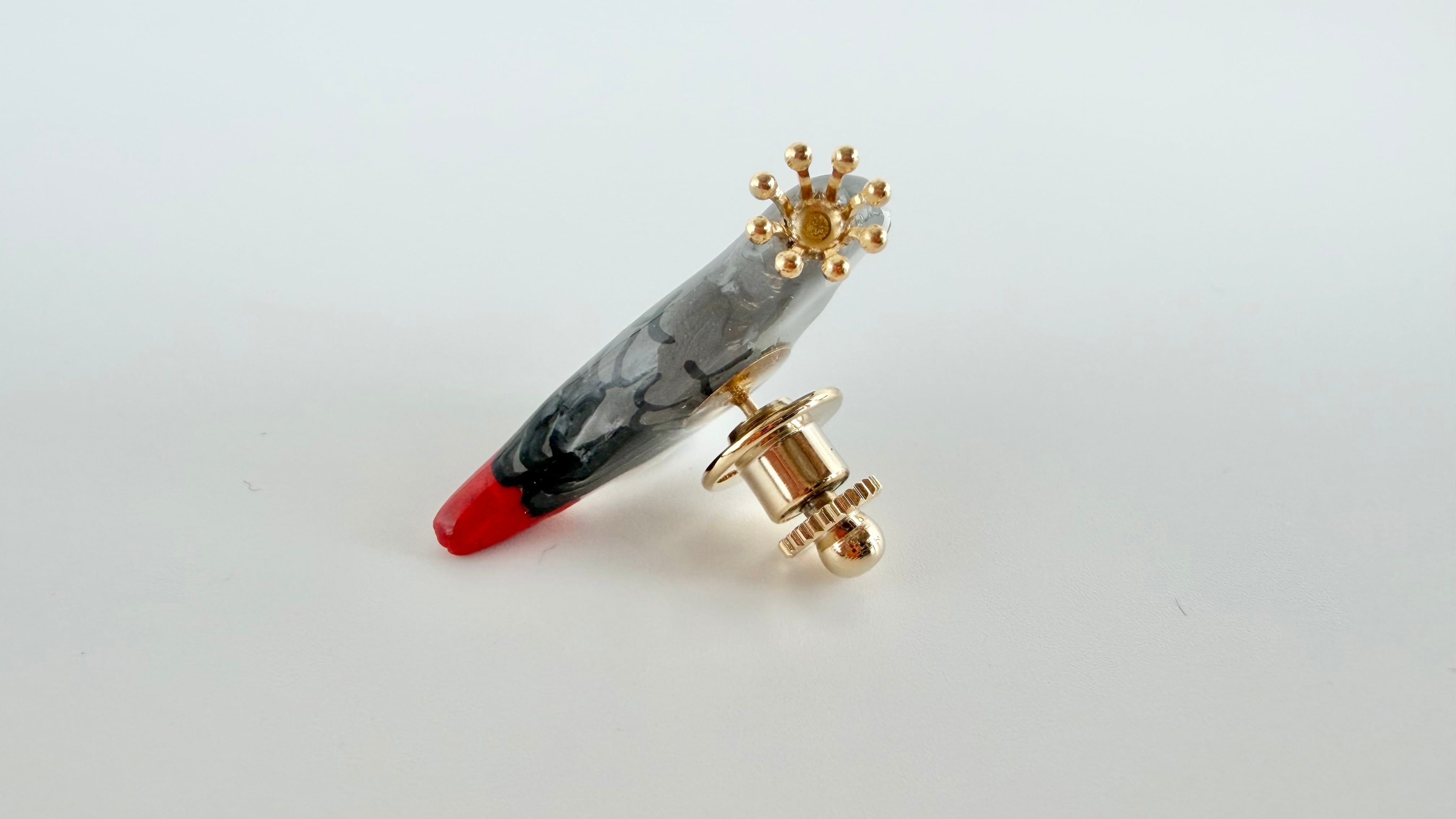 ヨウムのタックピンブローチ作品です。金色の王冠がアクセントになっています。