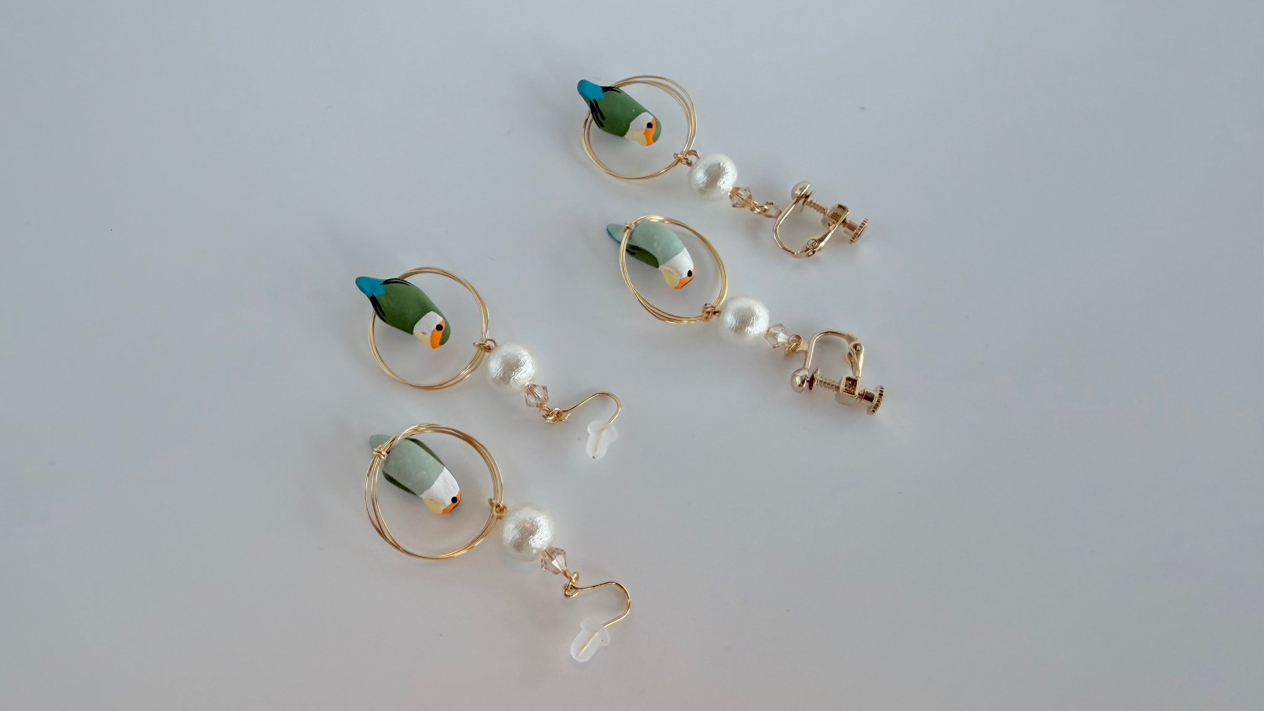 コザクラインコ(シーグリーン)をリングに乗せて、コットンパールを飾った爽やかなピアス・イヤリングです。