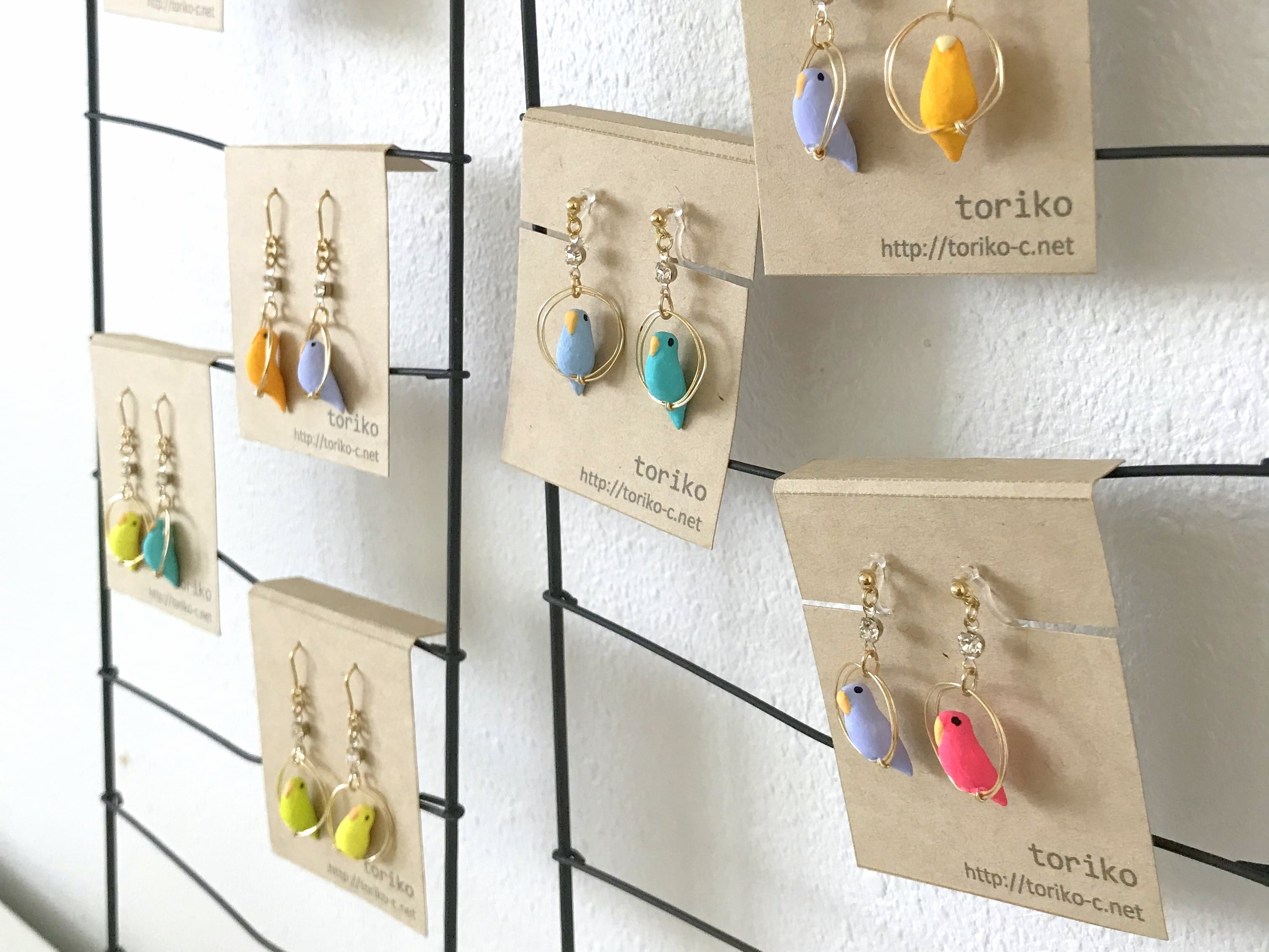 ワイヤーリングに乗った小さなインコが耳元でゆらゆら揺れるピアス・イヤリングです。
