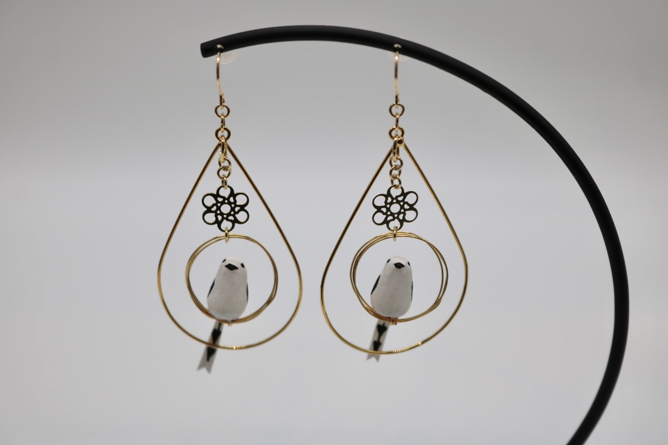 シマエナガをリングに乗せて、囲みパーツで華やかにしたピアス・イヤリングです。